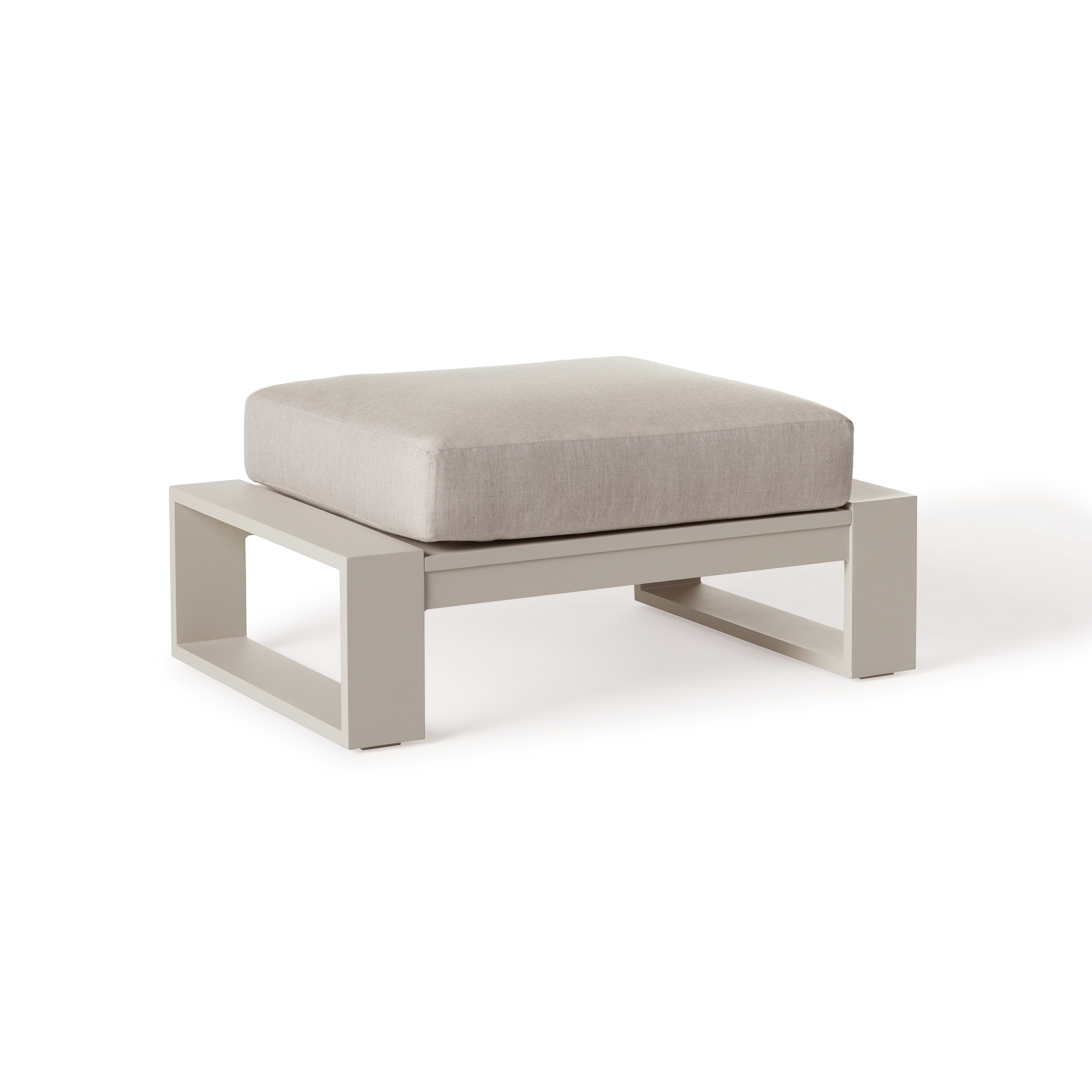 Slung-back style in sleek metal. Pure modernism with a bold architectural aesthetic. The Nicasio ottoman provides a place to sit or rest your feet while basking in the sun or the silence. Its ultra-thick cushion offers sink-in comfort while the powdercoated aluminum construction ensures lasting durability.