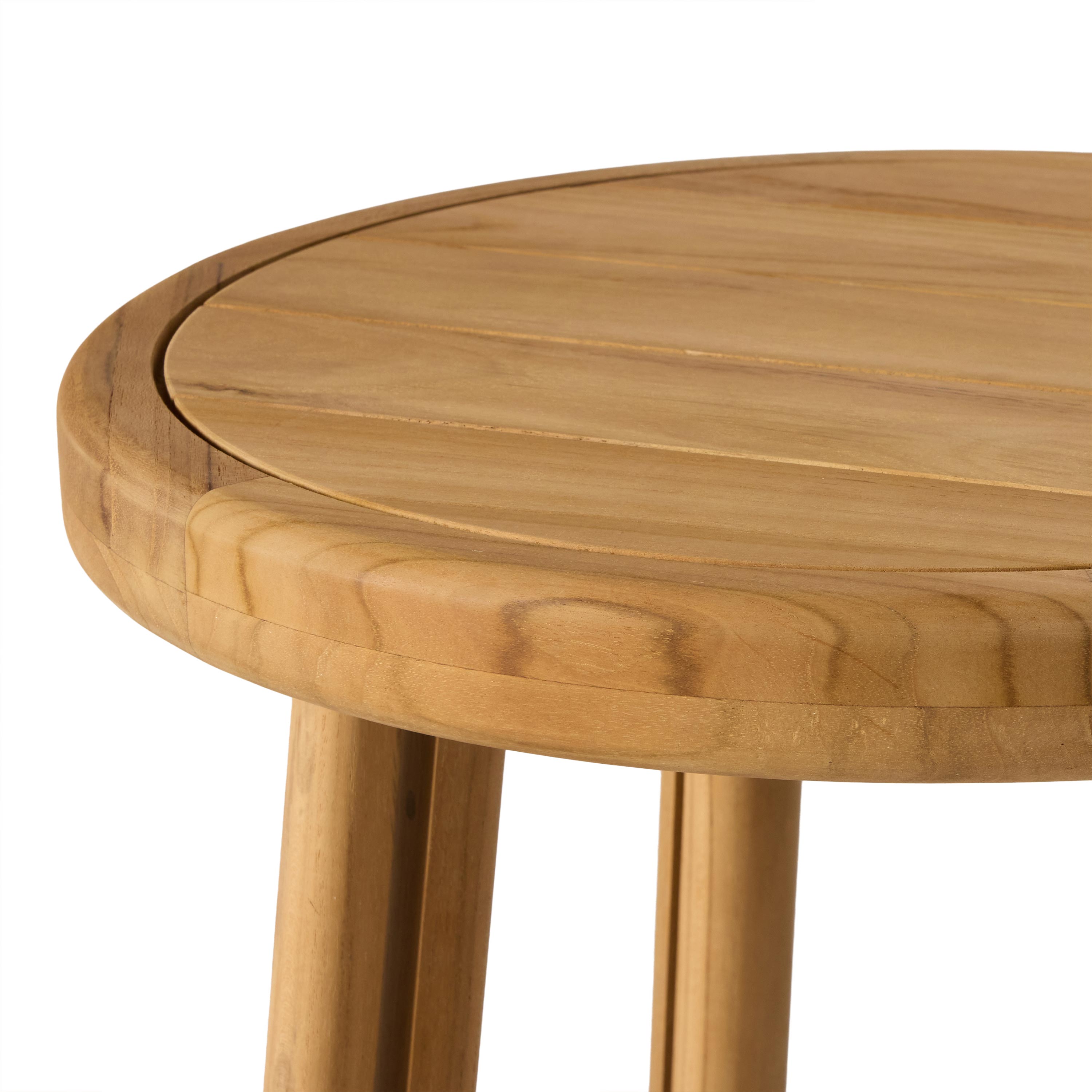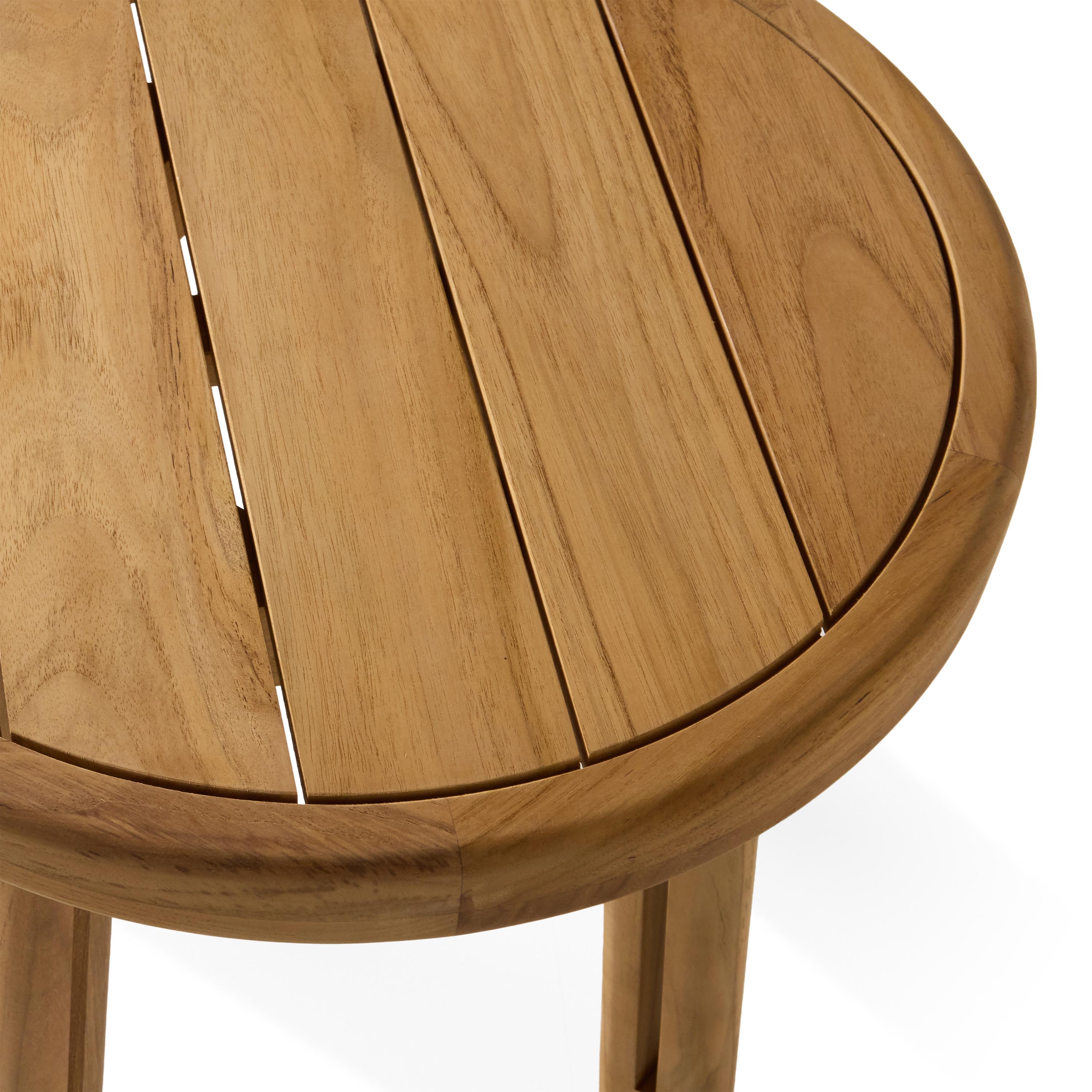 Stinson Side Table by Terra Outdoor Living. Made of premium teak in a natural finish, with curved edges. Compact slatted top provides space for a drink or book and allows water to drain, perfect alongside outdoor seating.