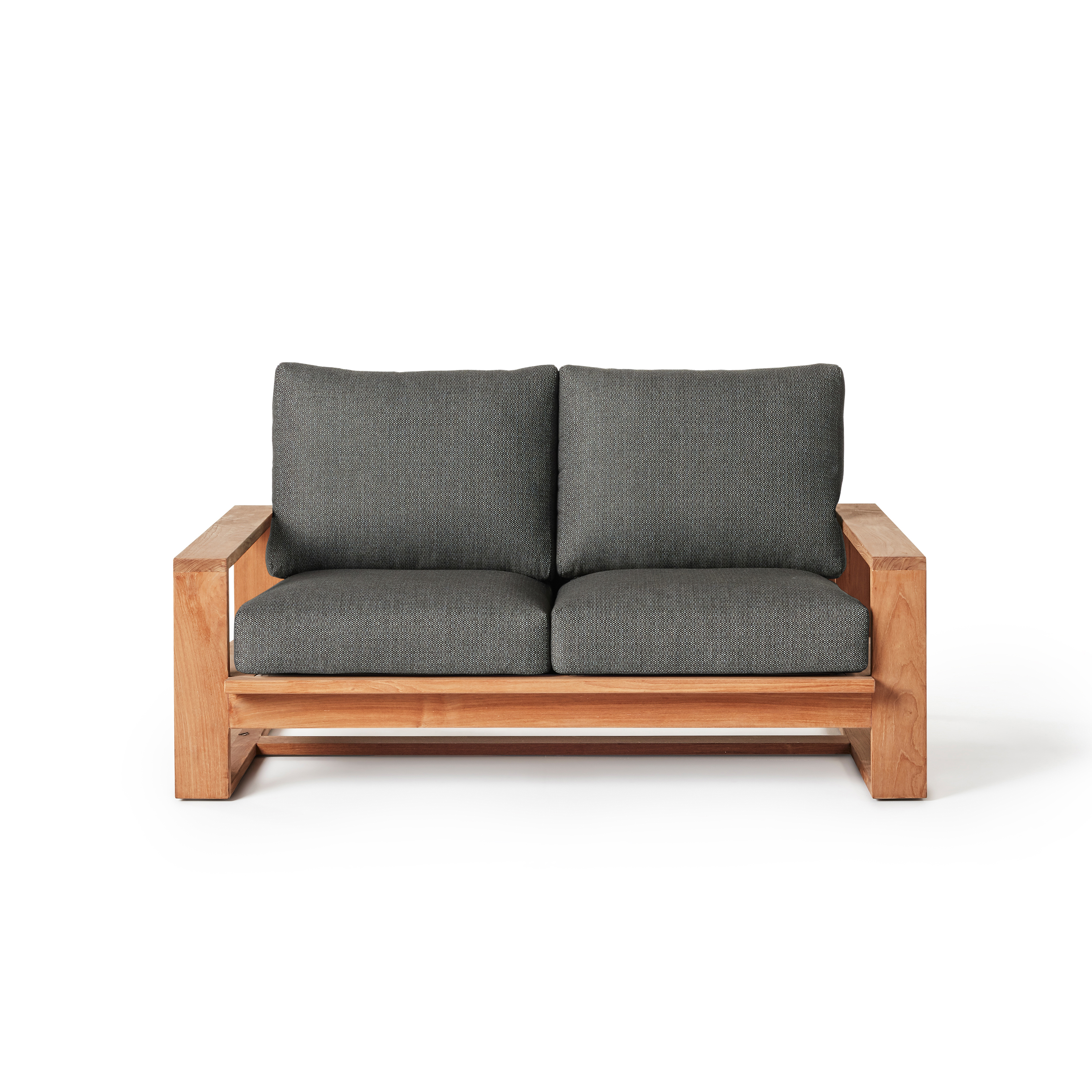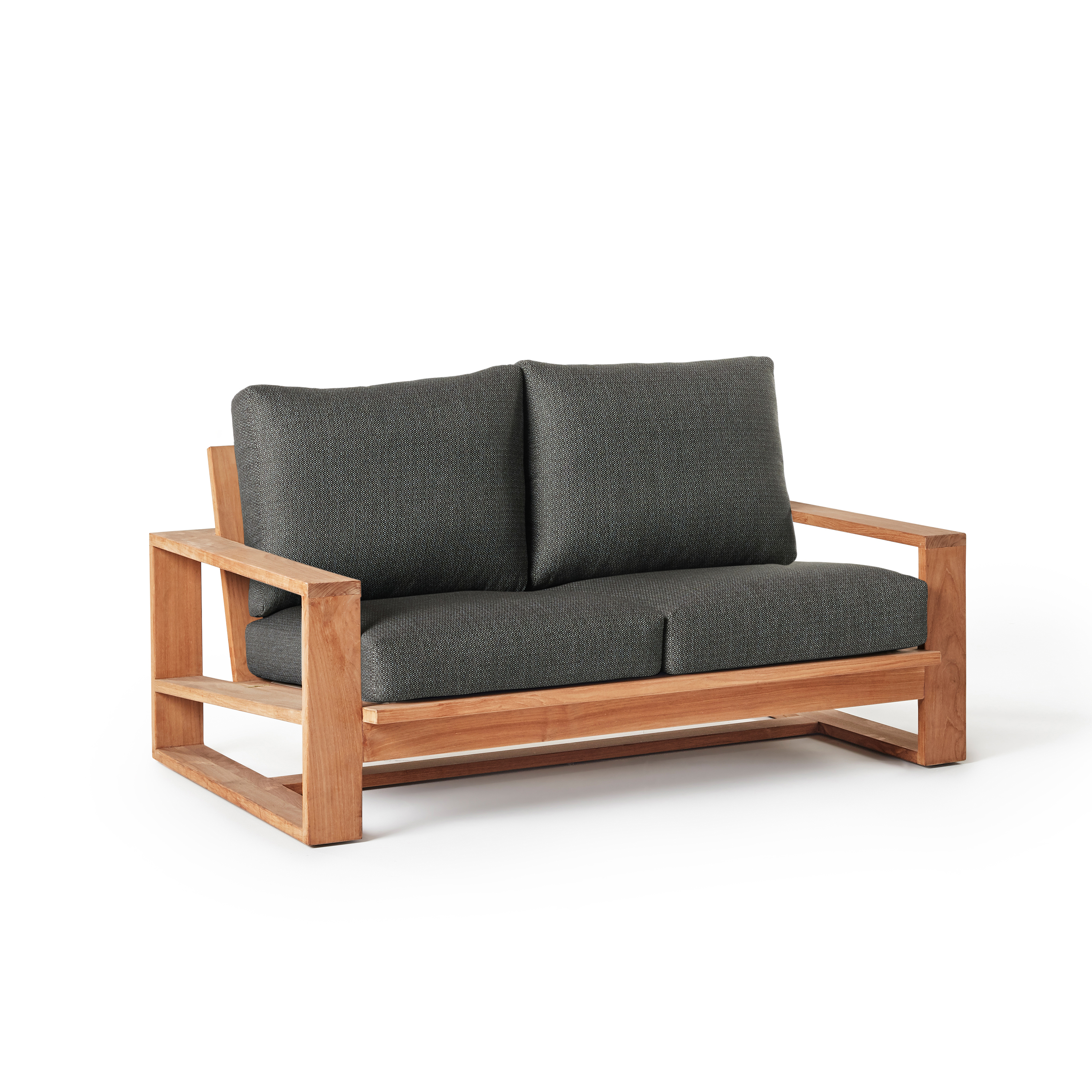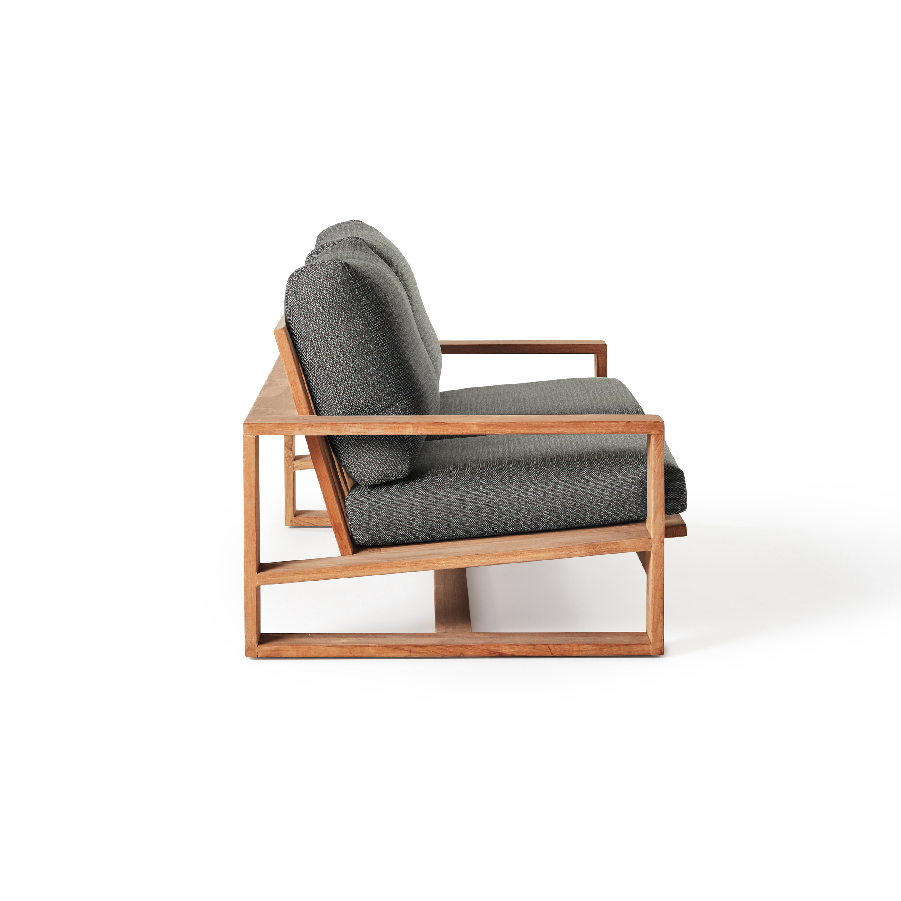 Pure modernism in warm wood. Wide arms flank seats and backs angled for leisure. Ultra-thick Sunbrella® cushions top Nicasio’s solid teak frames for clean lines with sink-in comfort. Matching tables echo the bold architectural aesthetic.