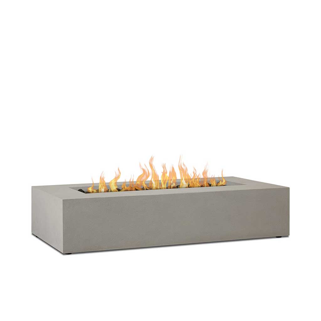 Clean lines and a rustic finish give the Aspen rectangular fire table an industrial edge while the low, modern profile suggests a sophisticated style. Featuring an efficient burner system that produces full, rich flames, choose from a flint or carbon color and complement this fire table with a matching propane tank cover. Includes protective cover, lava rock, and 8′ LP hose with regulator.