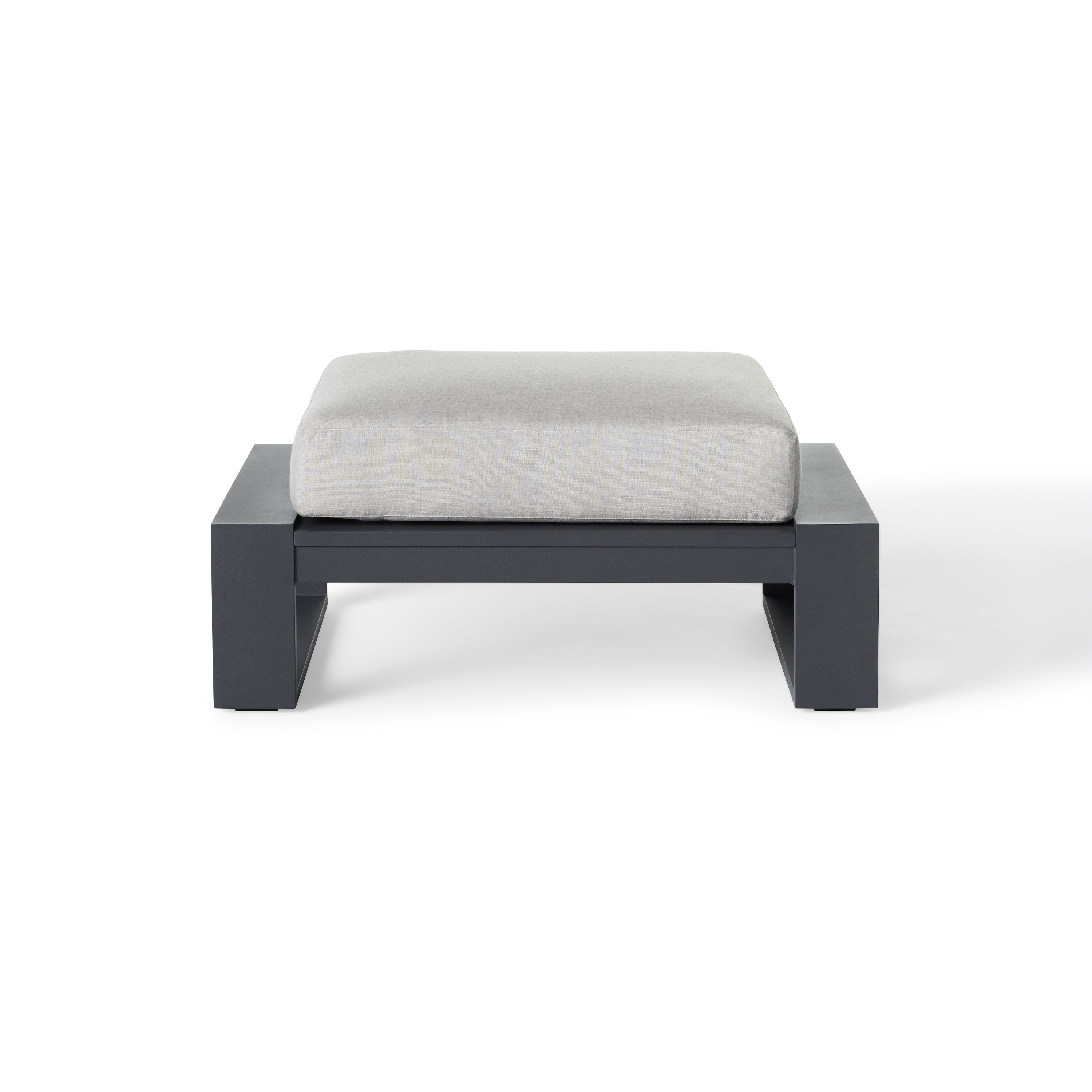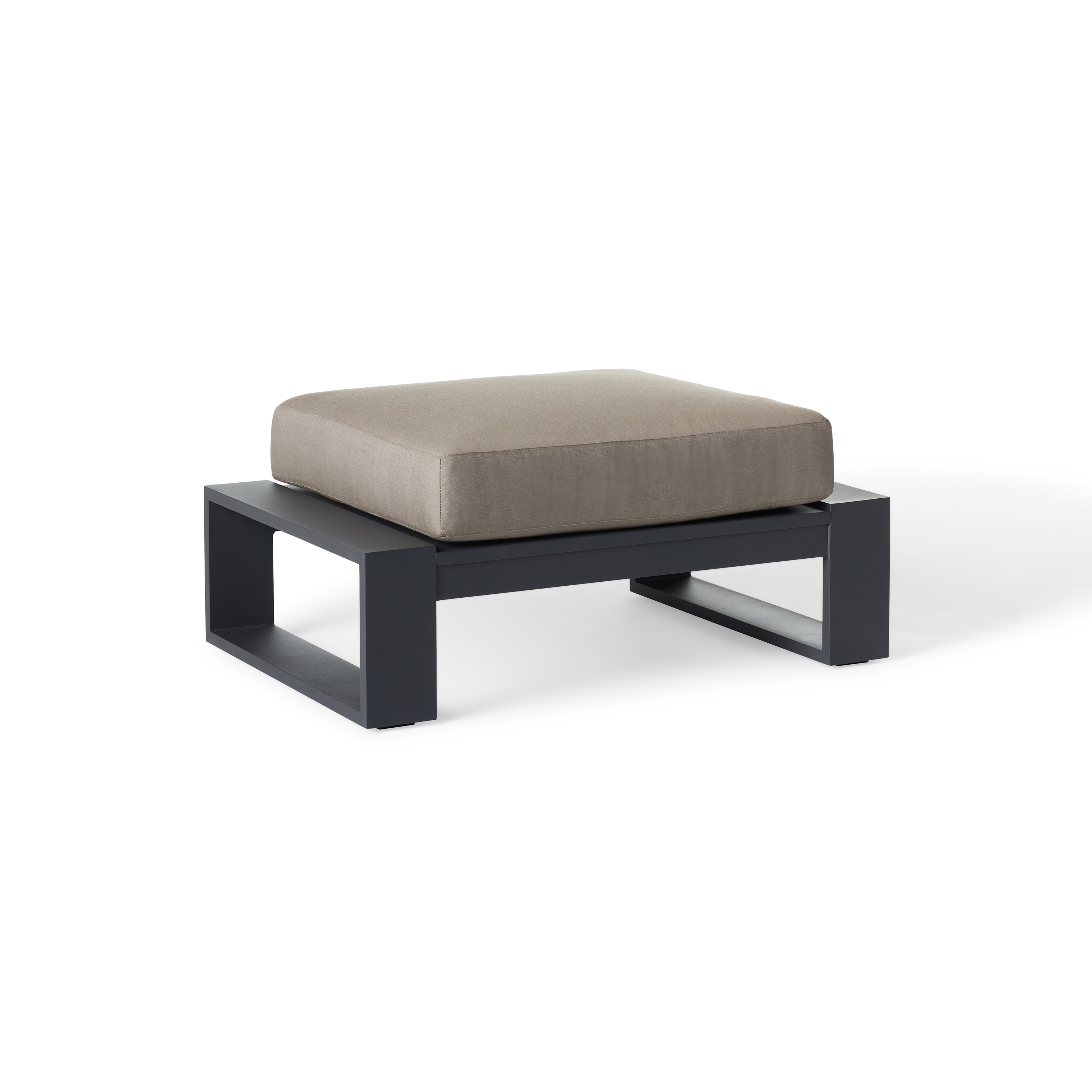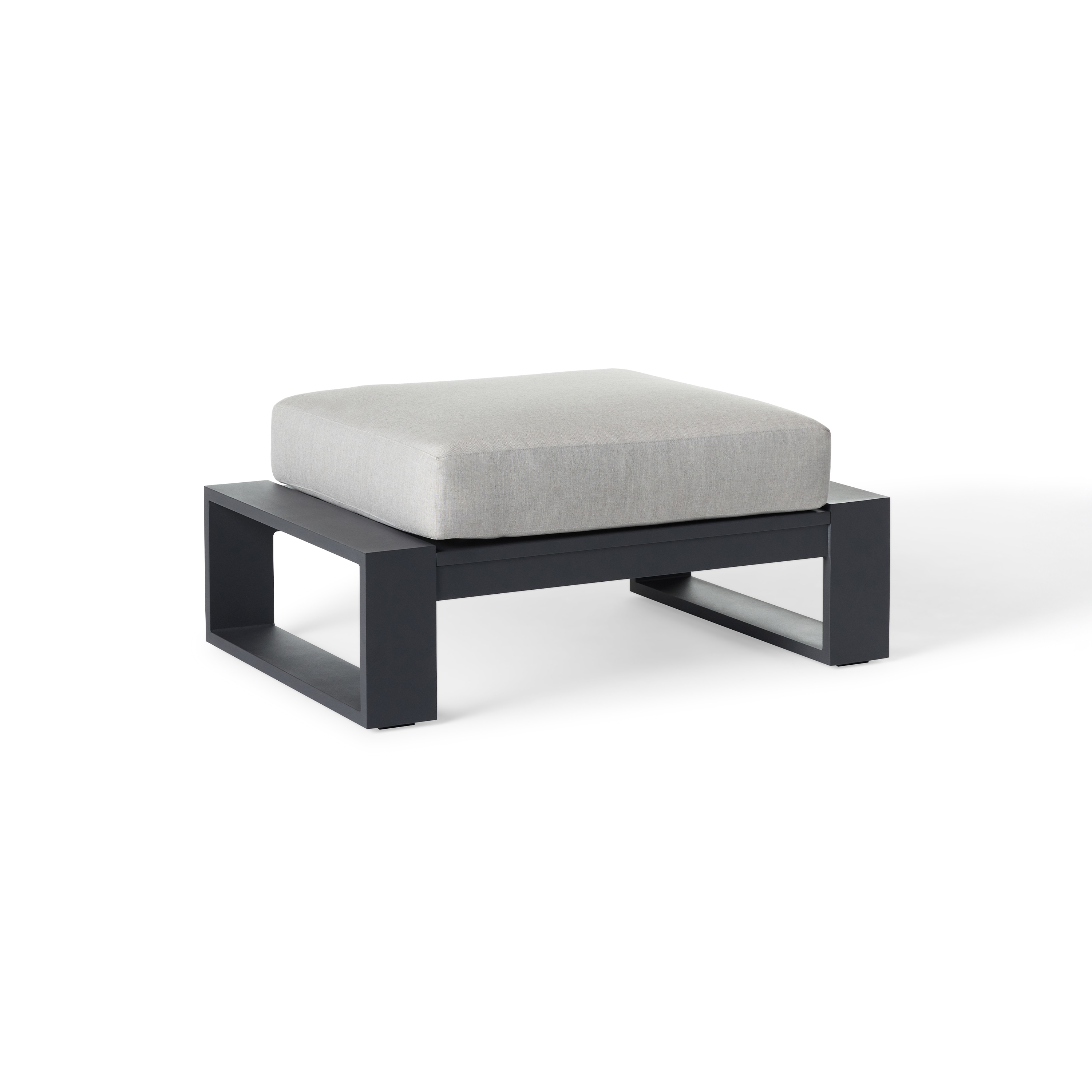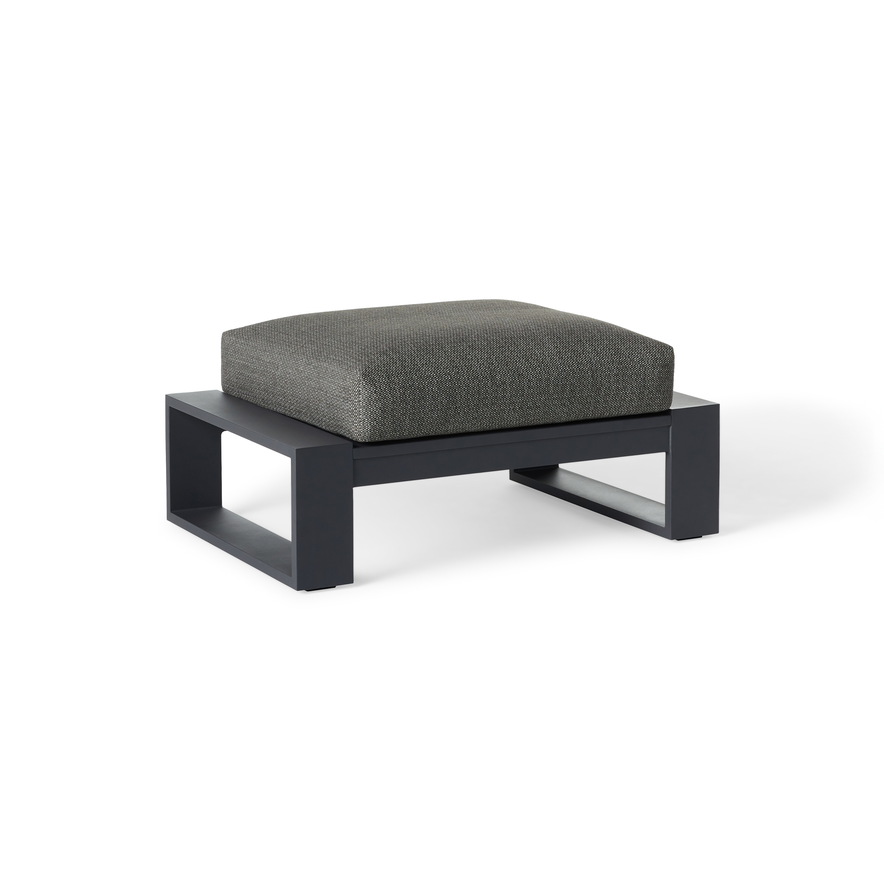 Slung-back style in sleek metal. Pure modernism with a bold architectural aesthetic. The Nicasio ottoman provides a place to sit or rest your feet while basking in the sun or the silence. Its ultra-thick cushion offers sink-in comfort while the powdercoated aluminum construction ensures lasting durability.