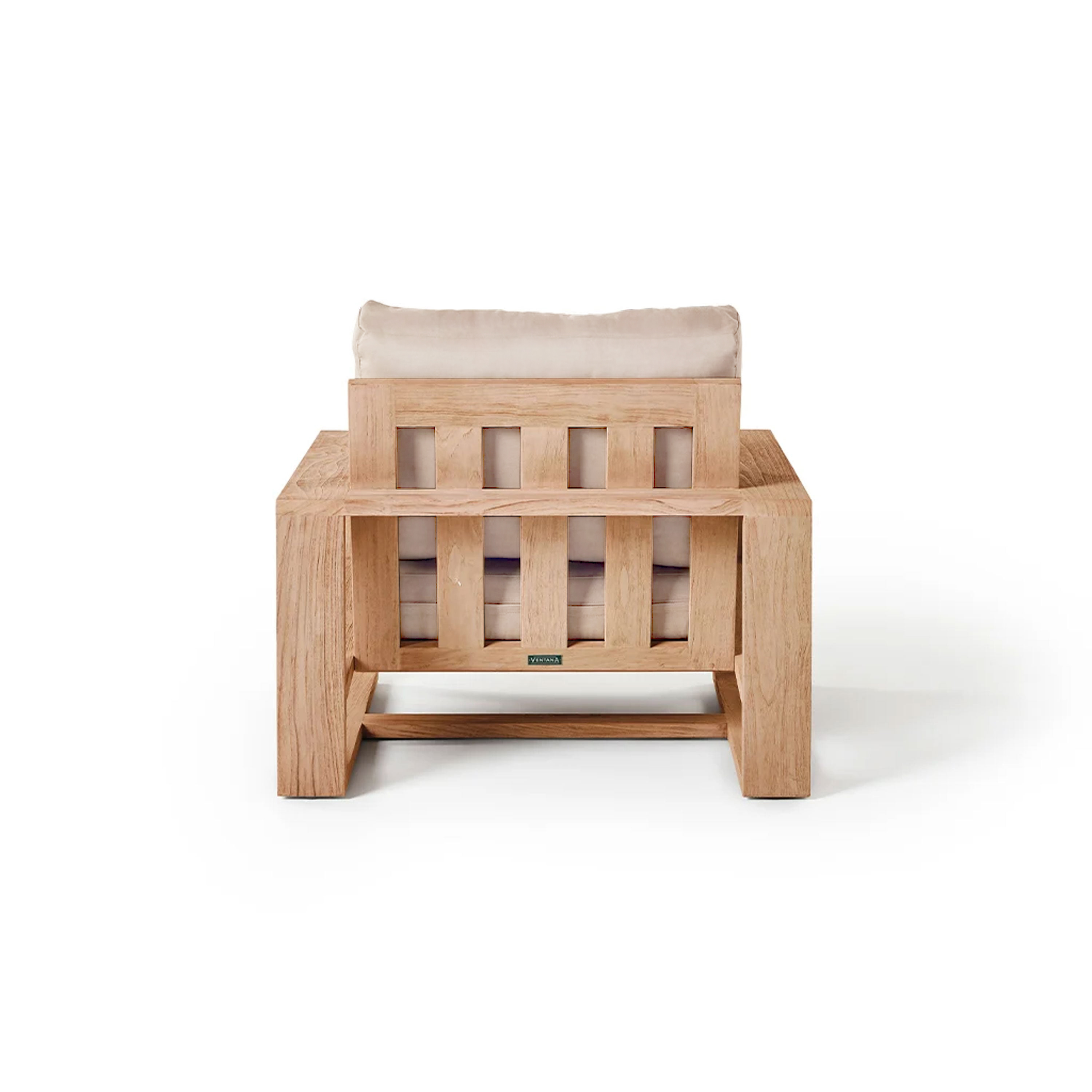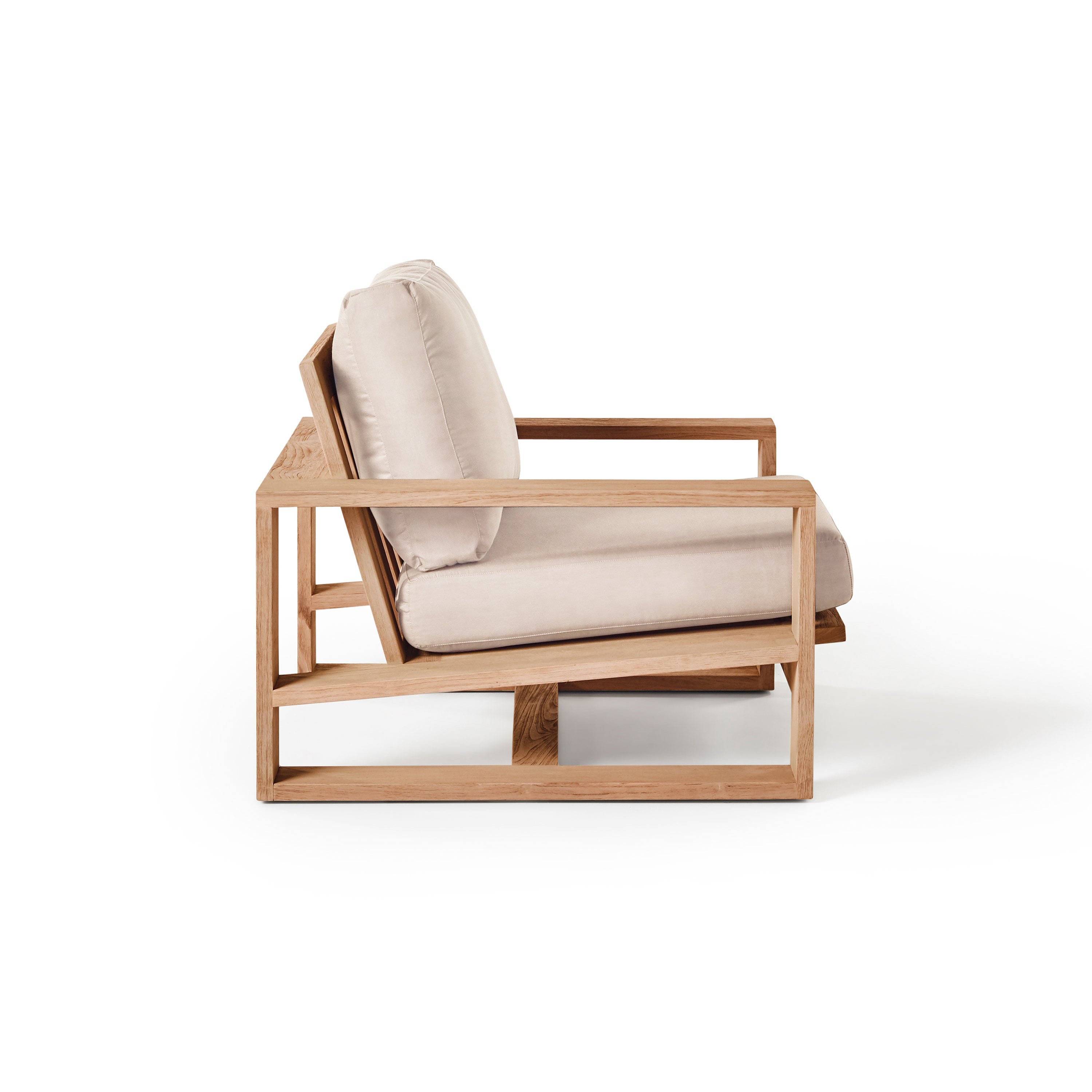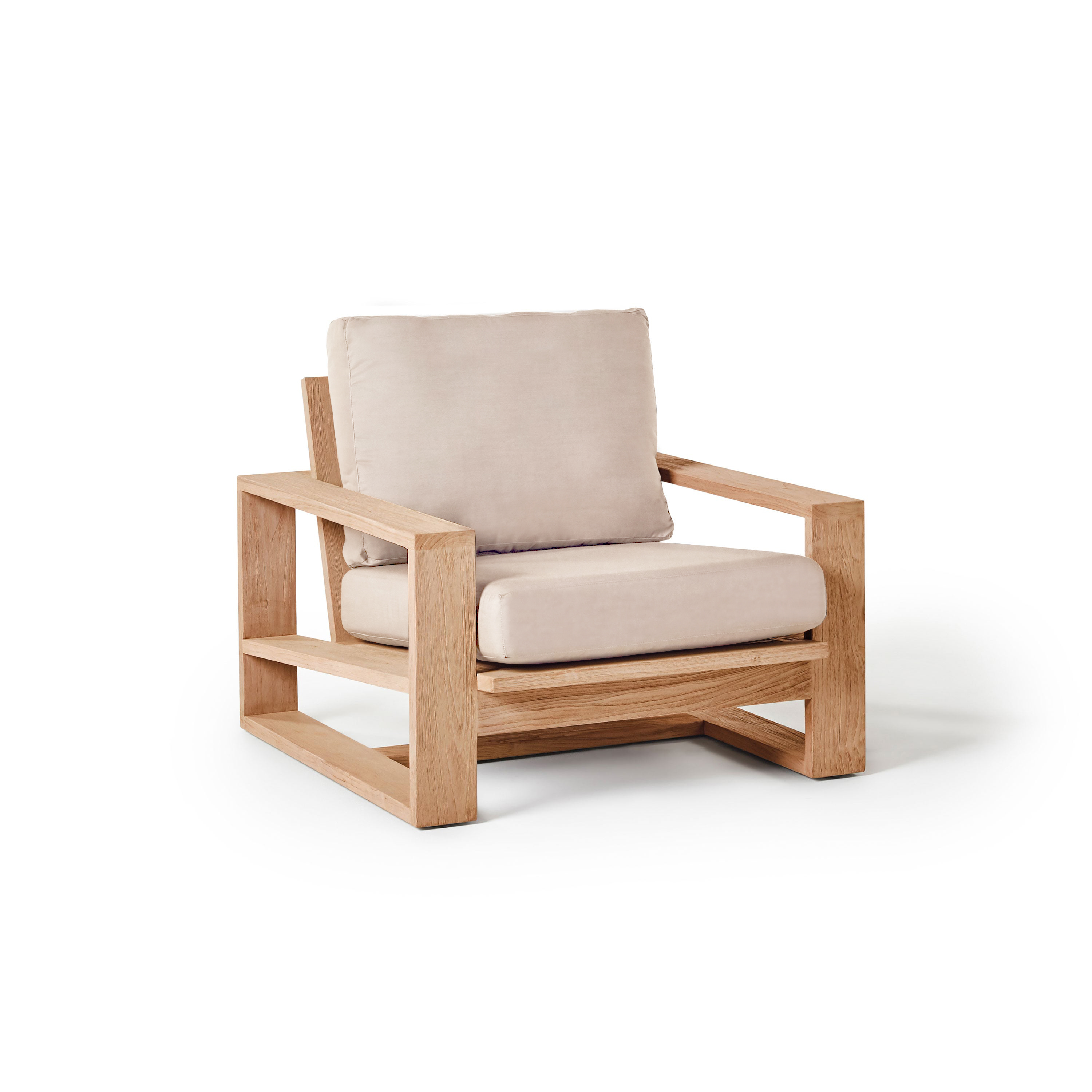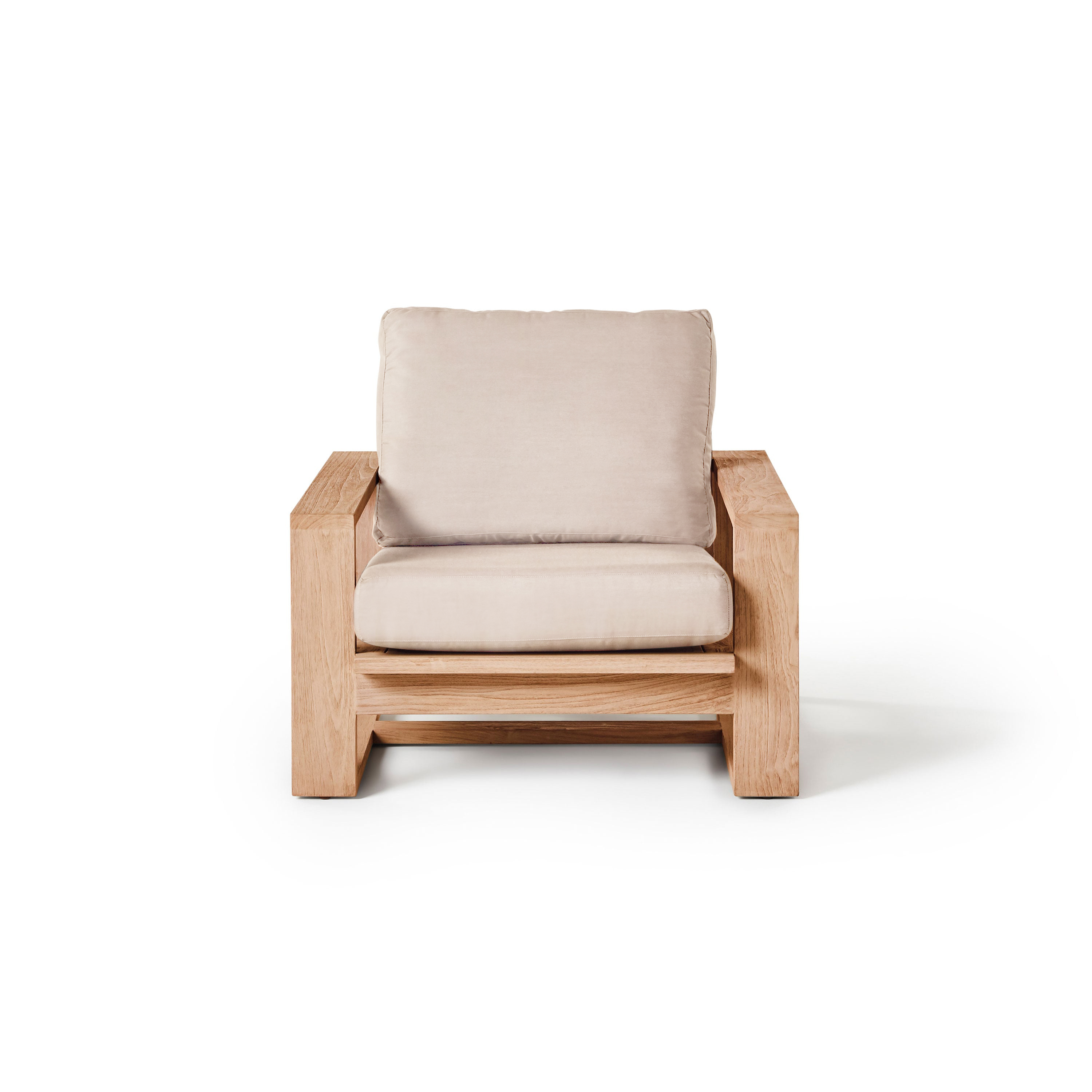 Pure modernism in warm wood. Wide arms flank seats and backs angled for leisure. Ultra-thick Sunbrella® cushions top Nicasio’s solid teak frames for clean lines with sink-in comfort. Matching tables echo the bold architectural aesthetic.