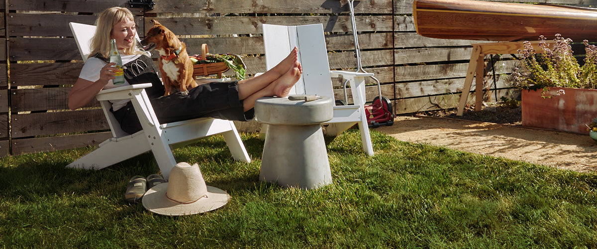 Pure relaxation. Comfort without cushions. Earth-friendly materials. Woodside is crafted of Envirowood – a durable, no-maintenance resin made with post-consumer recycled plastic. The chair throws a modern spin on the classic Adirondack with a squared-off back made from three bold planks, while its tipped seat and wide, flat arms invite you to settle in with a cool drink. The table reprises the three-part harmony with a segmented top supported by tapered plank legs.