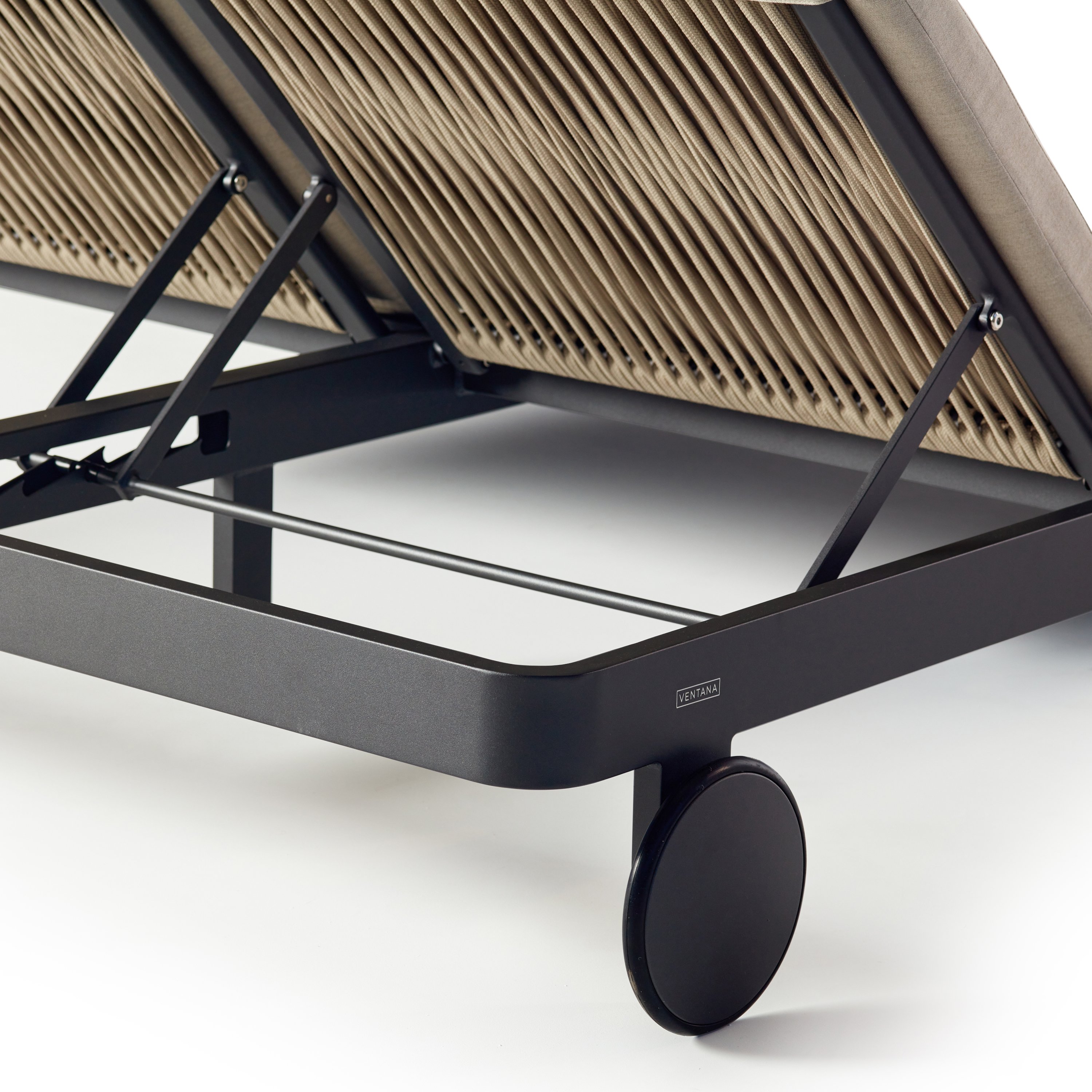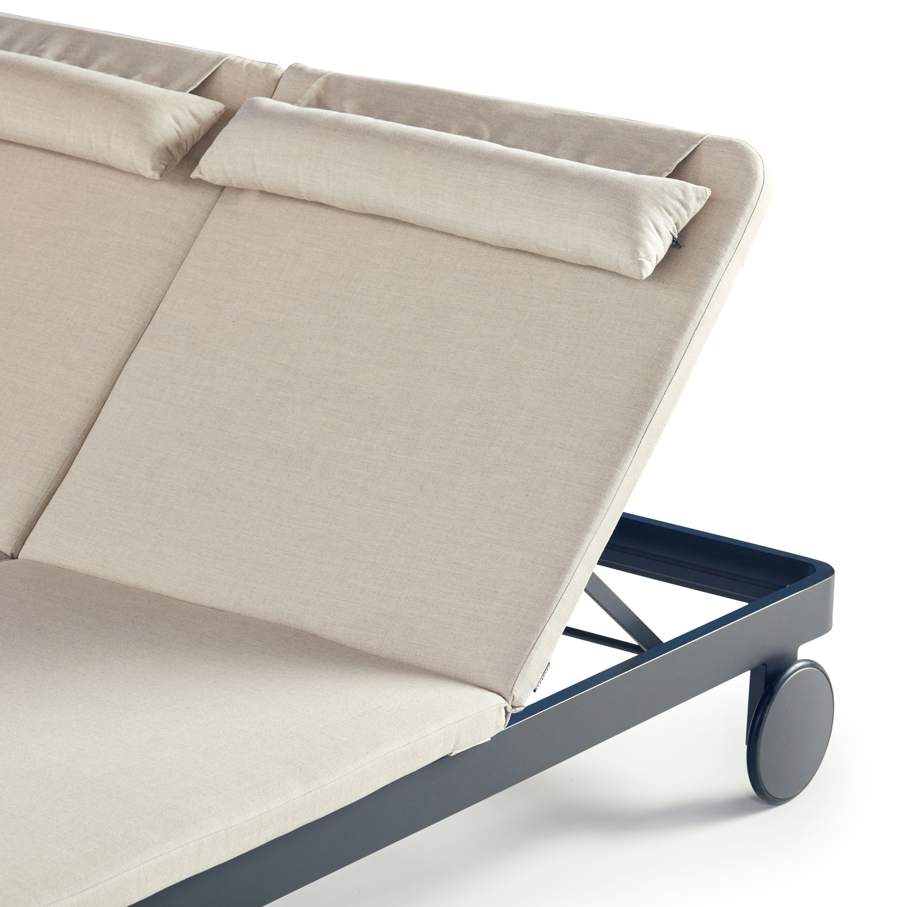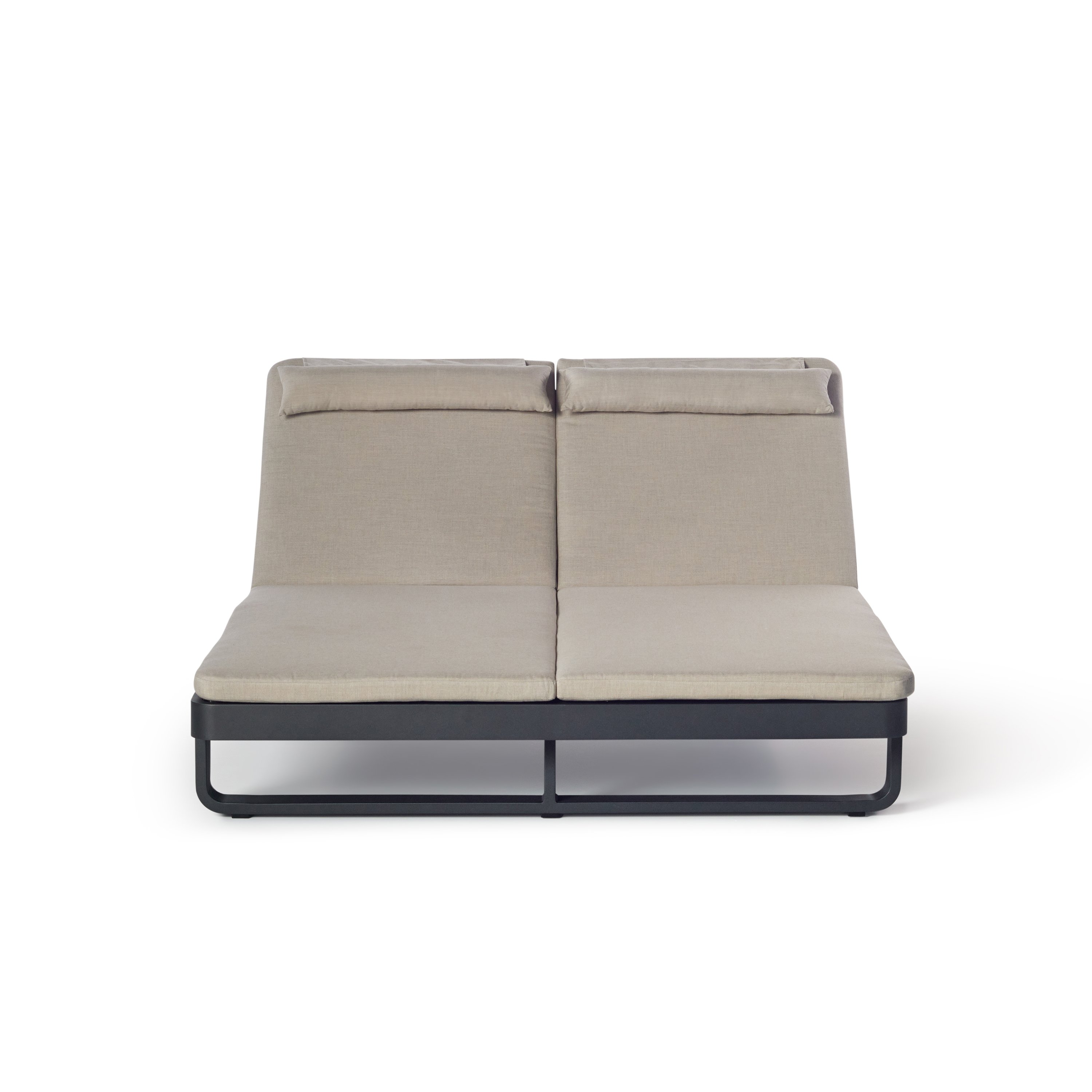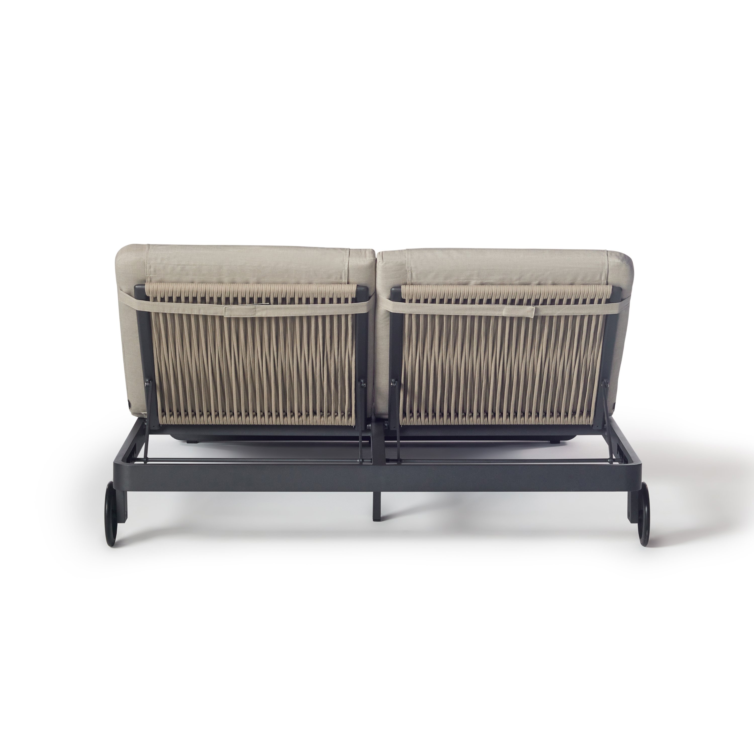 Matte-finished aluminum frames – rounded at the corners and wrapped in Italian all-weather rope – give the Cambria Double Chaise a style-setting mix of crisp lines and soft textures. Topped with a fast-drying cushion with a built-in headrest, the chaise adjusts to the perfect position for reading, relaxing or napping.