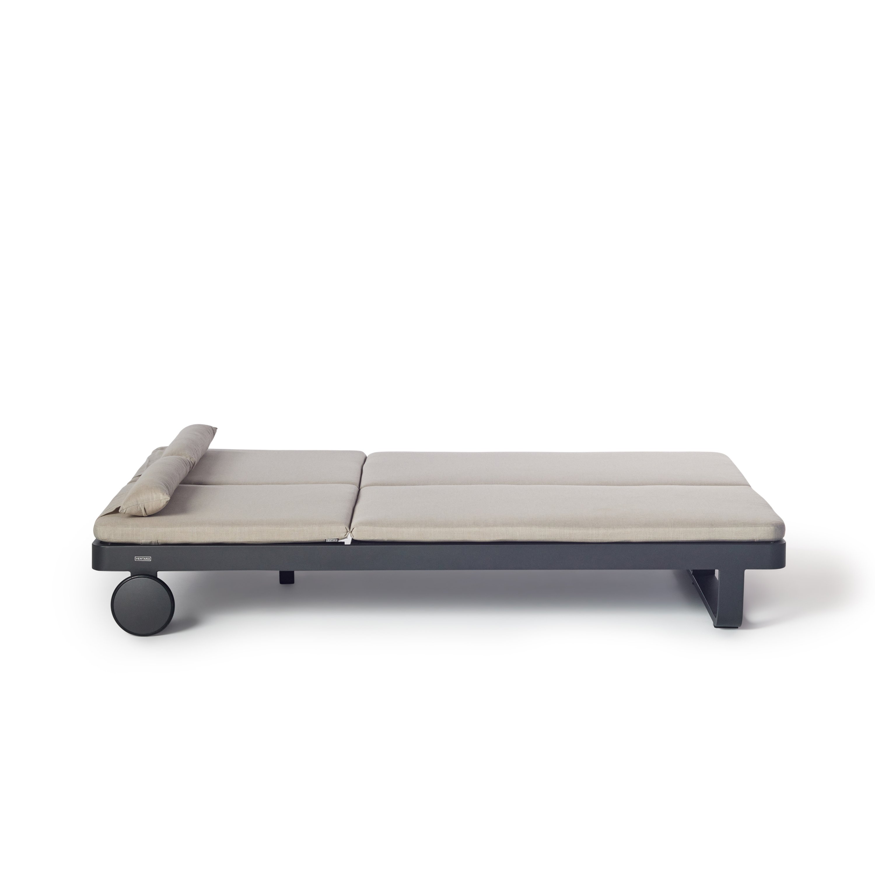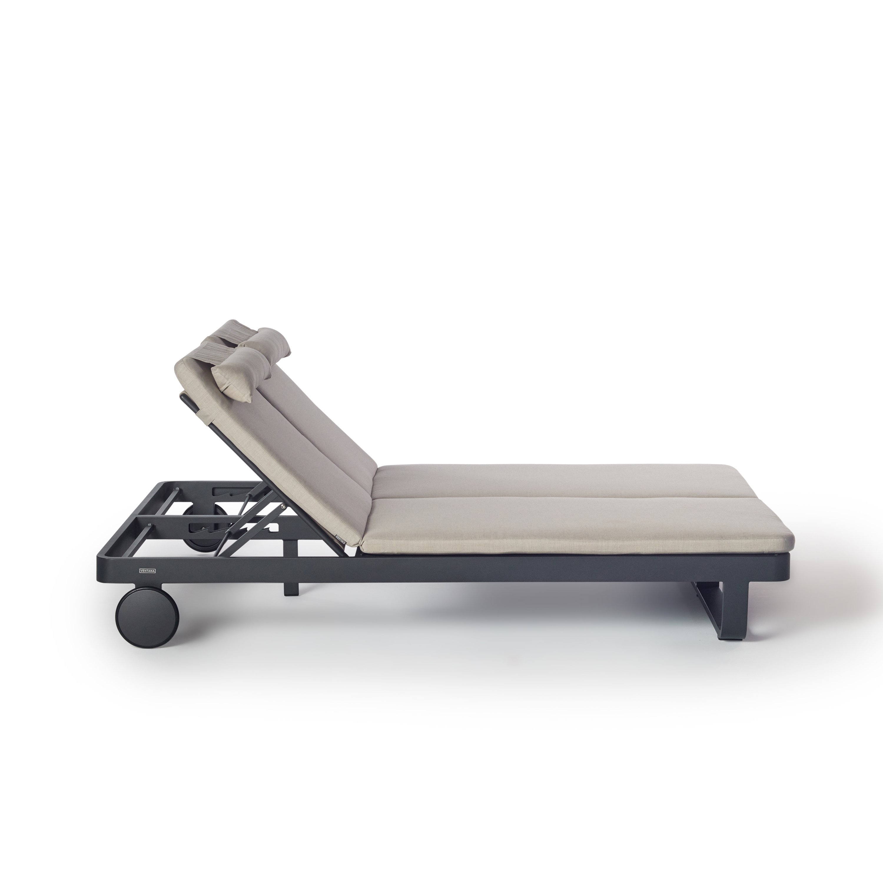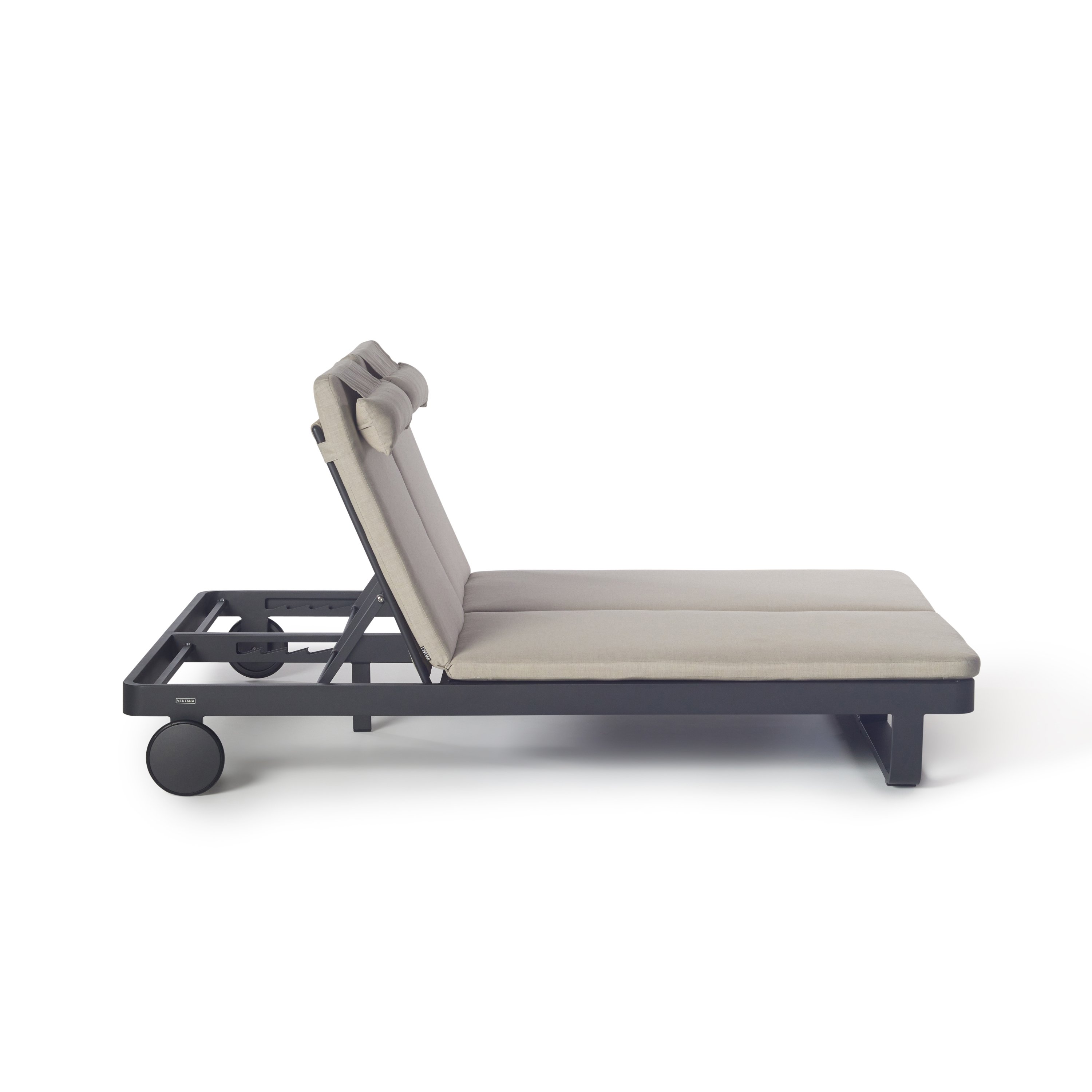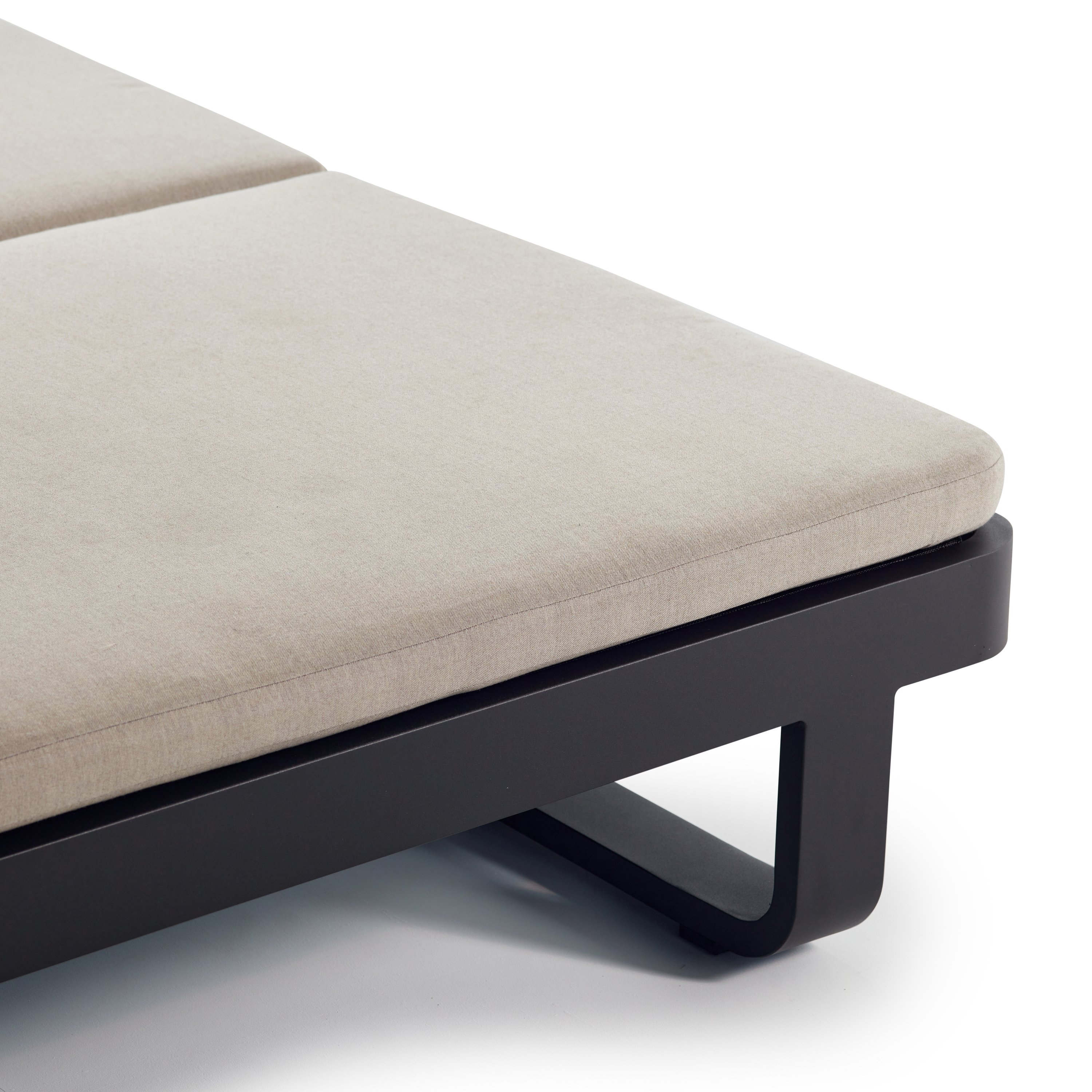 Matte-finished aluminum frames – rounded at the corners and wrapped in Italian all-weather rope – give the Cambria Double Chaise a style-setting mix of crisp lines and soft textures. Topped with a fast-drying cushion with a built-in headrest, the chaise adjusts to the perfect position for reading, relaxing or napping.