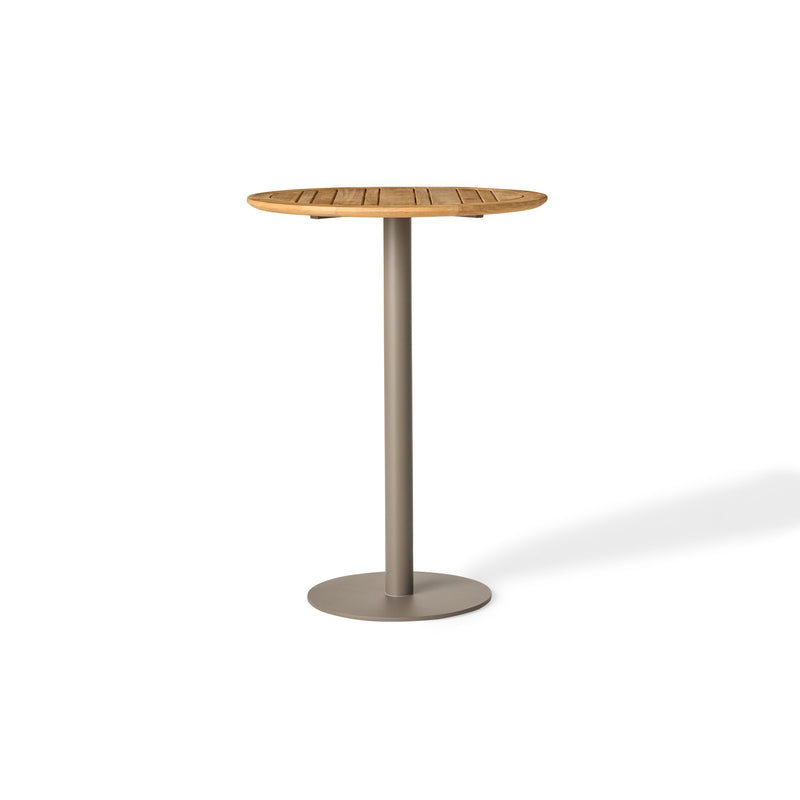 Bistro style with minimalist lines. Looks and longevity in equal measure. Palm pairs weather-friendly powdercoated Aluminum with solid kiln-dried teak in silhouettes designed for dining and entertaining al fresco. Choose from two finishes and two shapes to create your perfect bar table