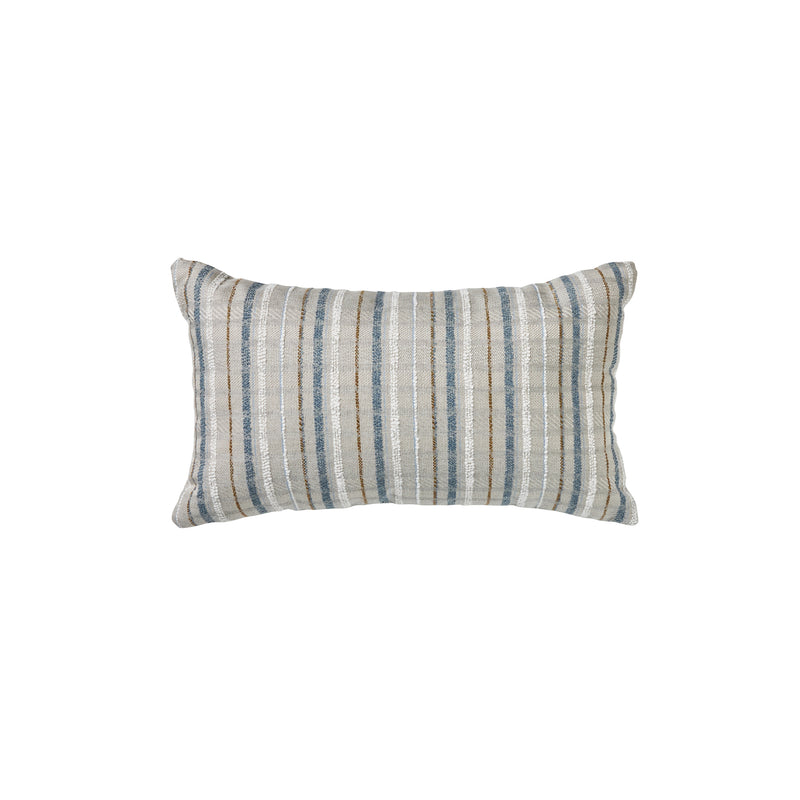 The Reaction pillow's varied yarns and weave patterns coalesce to create a rich, dimensional plaid. High contrast vertical stripes pop out from tonal ground colors for a lively, yet streamlined visual appeal.
