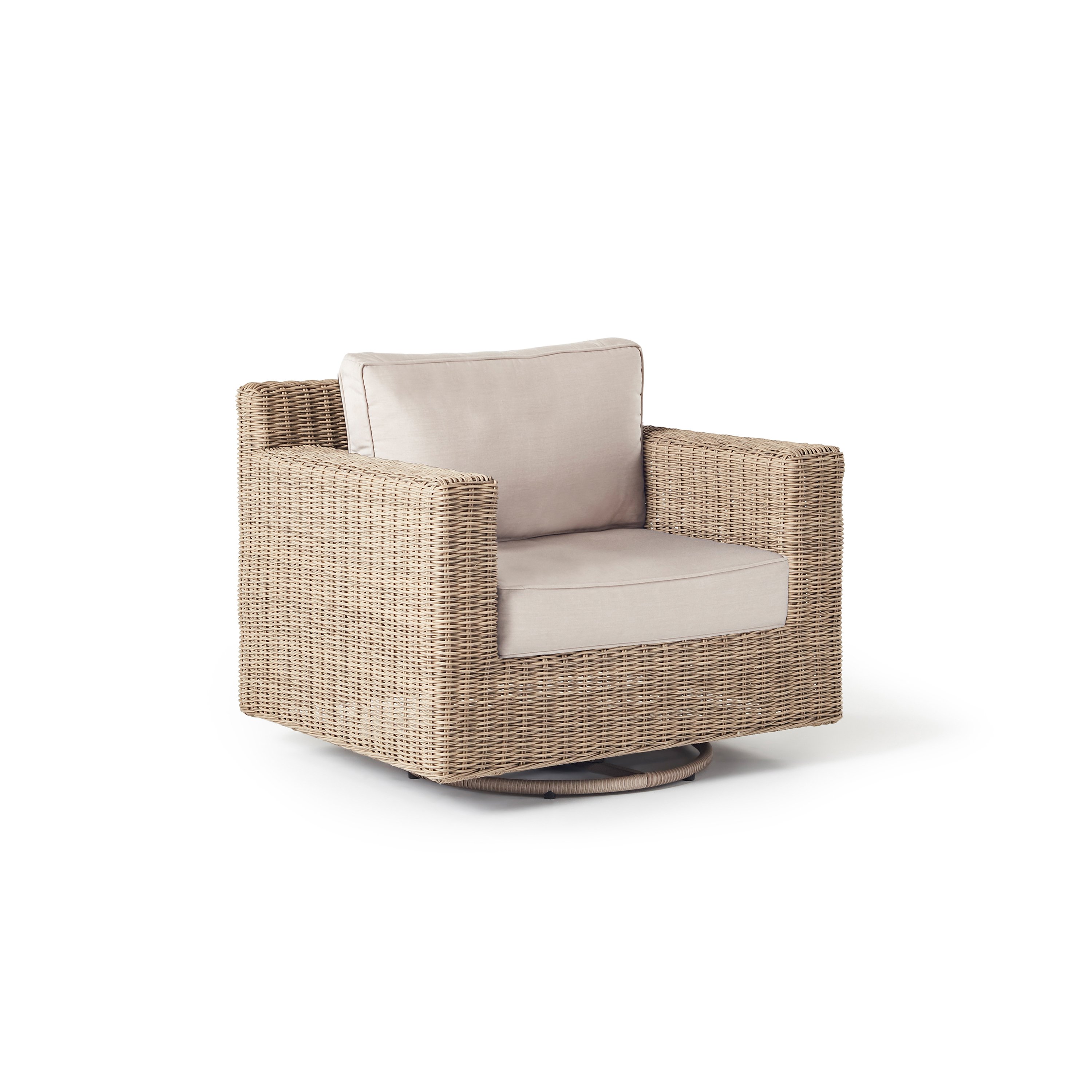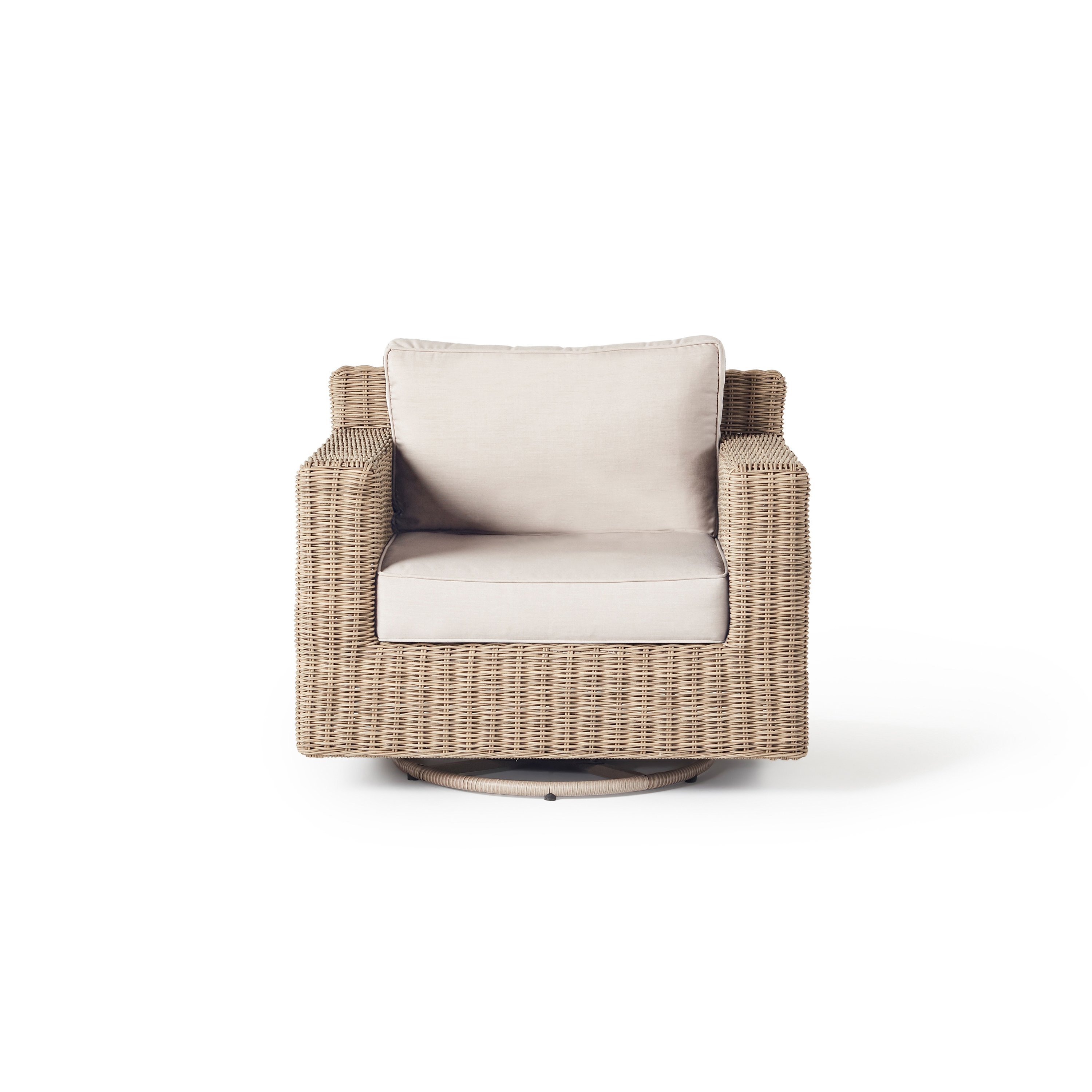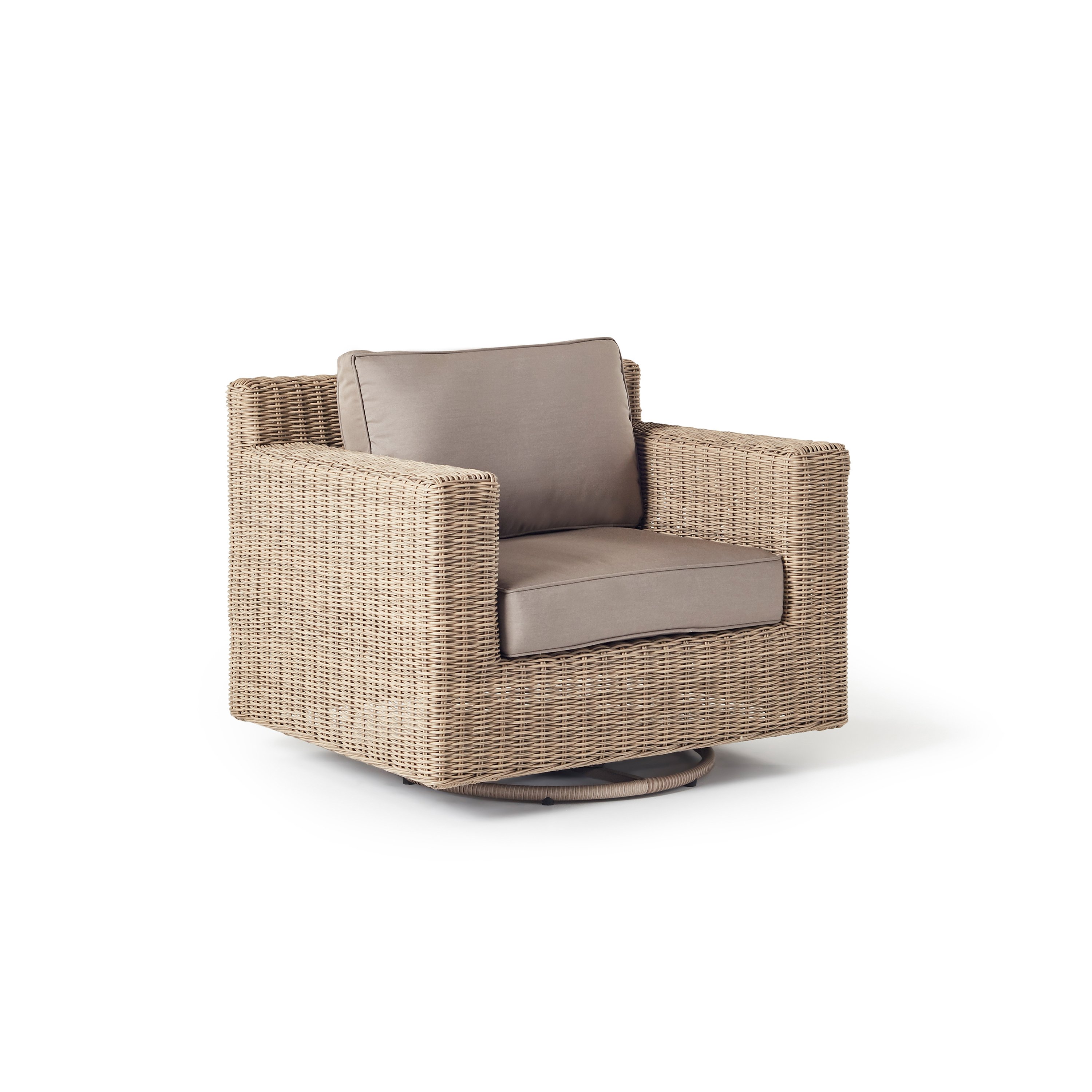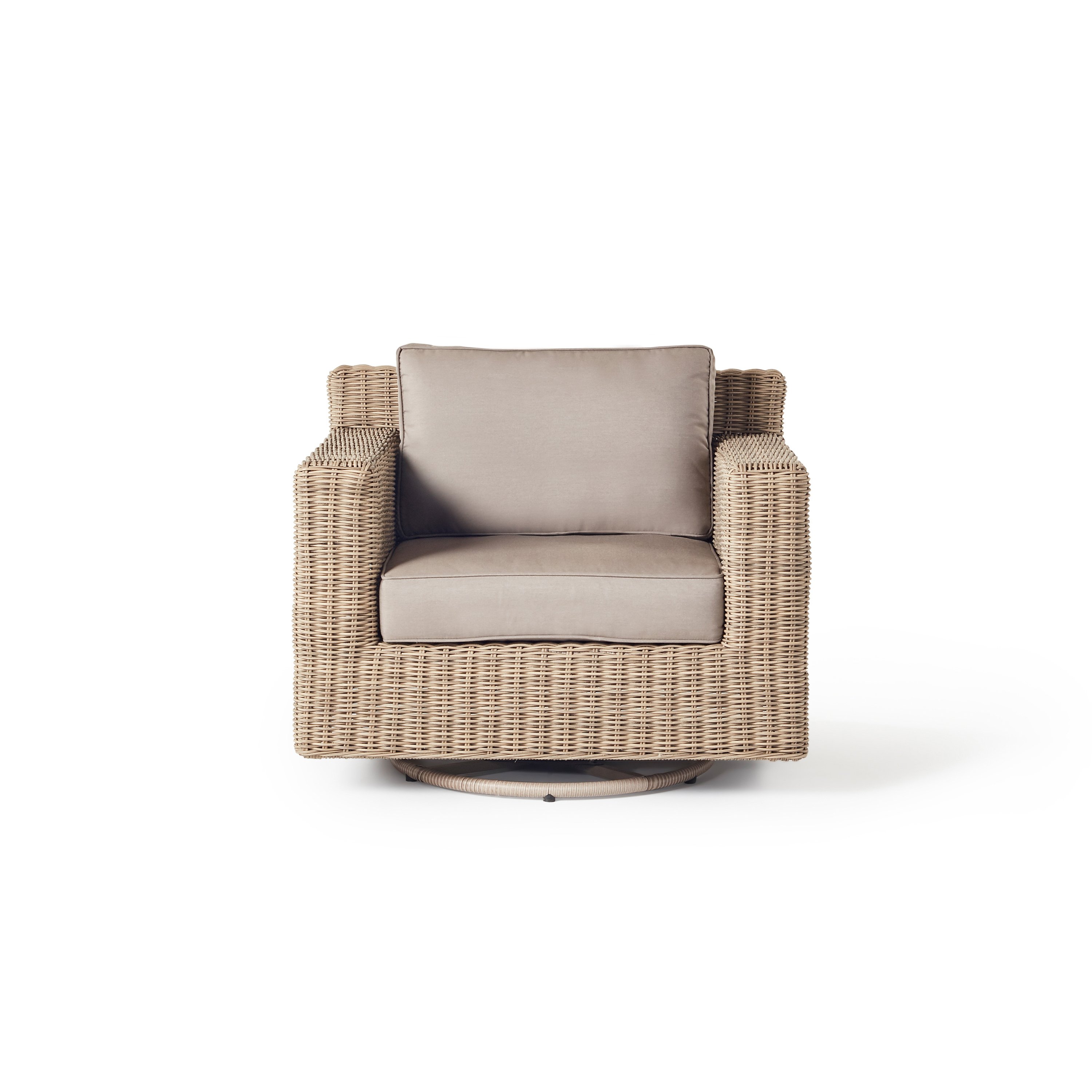 - Swiveling base is wrapped in all-weather wicker for visual appeal
